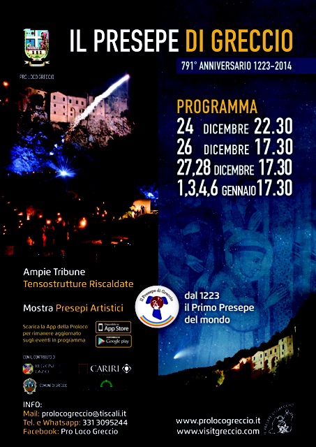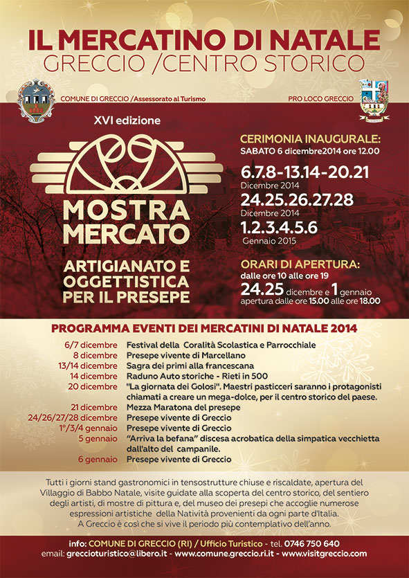 A accogliere i visitatori in un ambiente magico e familiare, fatto di colori, luci, sapori e musica, sarà un sapiente mix di eccellenze tra arte presepiale e artigianato, una miscela di tradizione, presepi artistici, decorazioni natalizie, artigianato in legno, vetro, metallo, ceramica, sculture, ricami, pizzi, merletti e prodotti tipici locali. Nel suggestivo percorso fra le casette di legno, sarà possibile trovare originali idee regalo, intrattenersi presso il Villaggio di Babbo Natale e gustare le specialità gastronomiche della zona. Ricchissimo il programma degli eventi. Il 6 e 7 dicembre è previsto il Festival della Coralità Scolastica e Parrocchiale, mentre l’8 andrà in scena il Presepe vivente di Marcellano; il 13 e 14 si tornerà indietro nel tempo con la Sagra dei primi alla francescana e il Raduno auto storiche “Rieti in 500” (solo nella giornata del 14); il 20 dicembre sarà la volta della “Giornata dei Golosi”, con maestri pasticceri che creeranno un mega-dolce per il centro storico del paese, mentre il giorno successivo è in programma la Mezza maratona del presepe. Il 24, 26, 27 e 28 dicembre, e ancora l’1, 3, 4 e 6 gennaio andrà in scena il Presepe di Greccio, unico e inimitabile, mentre il 5 gennaio ci sarà la discesa acrobatica della Befana dall’alto del campanile.