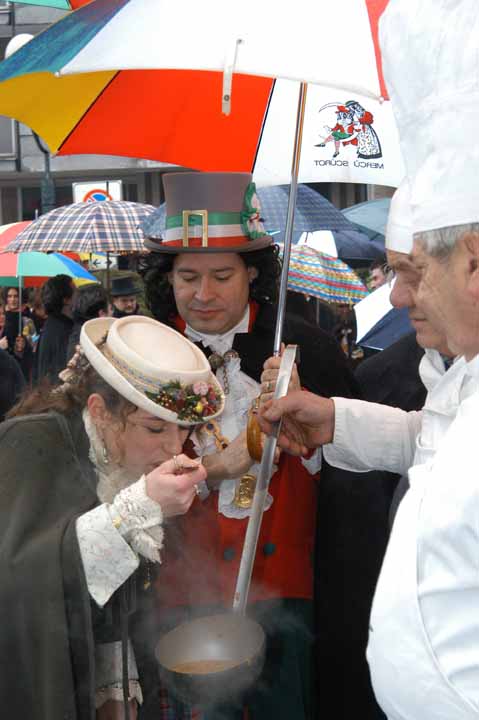 Dopo la cerimonia della consegna delle chiavi della Città Peru e Gin – la leggenda vuole che quando non è carnevale il Peru stia in giro e la Gin, sua fedele compagna e regina lo aspetti – danno il via ai festeggiamenti inaugurando la distribuzione della Busecca, insieme alla lingua con bagnetto (trito di prezzemolo, aglio, olio, uova e qualche spezia), alla lasagna, i bolliti misti con bagnetto e mostrada, la toma Valsesiana e la frutta.