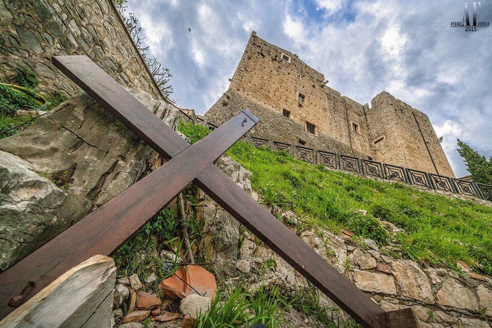 A seguire la suggestiva flagellazione, con la conseguente lettura della condanna a morte e per finire l’impressionante quadro dell’impiccagione di Giuda da il via alla via crucis, che si snoda per l’arteria più importante del paese, trasformata per l’occasione in via dolorosa, per poi concludersi e culminare con la scena struggente della crocifissione sulla scarpata sottostante al castello baronale nella piazza F. Lepri.