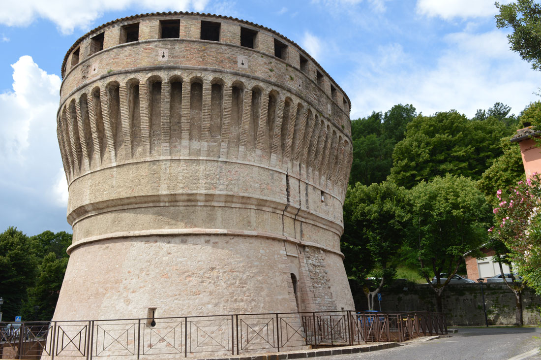 Sorge lungo l’antica via Flaminia alle pendici del monte Petrano, là dove il torrente Bosso si unisce al Burano. E’ Cagli, uno dei gioielli della provincia di Pesaro e Urbino: l’antica Cale che sotto il dominio bizantino fu – insieme a Gubbio, Urbino, Fossombrone e Jesi – uno dei capisaldi della Pentapoli interna o montana. Un viaggio alla scoperta di questa cittadina ricca di storia e monumenti non può che partire dal Torrione martiniano (nella foto), che fa parte di un imponente sistema di fortificazione progettato dall’architetto senese Francesco di Giorgio Martini su commissione del Duca Federico da Montefeltro. Il complesso architettonico, ancora in costruzione nel 1481, si componeva di una poderosa Rocca, in posizione sopraelevata rispetto al piano cittadino e del Torrione, inserito nella cinta urbica medievale. Se della Rocca non rimangono oggi che delle rovine, intatto rimane il fascino suscitato dalle forme e dagli ambienti del Torrione: dalla caratteristica forma a ellisse, si sviluppa su 5 piani raccordati da scale lumacate culminanti nel ballatoio aperto in cui caditoie e feritoie si alternano a difesa della città.